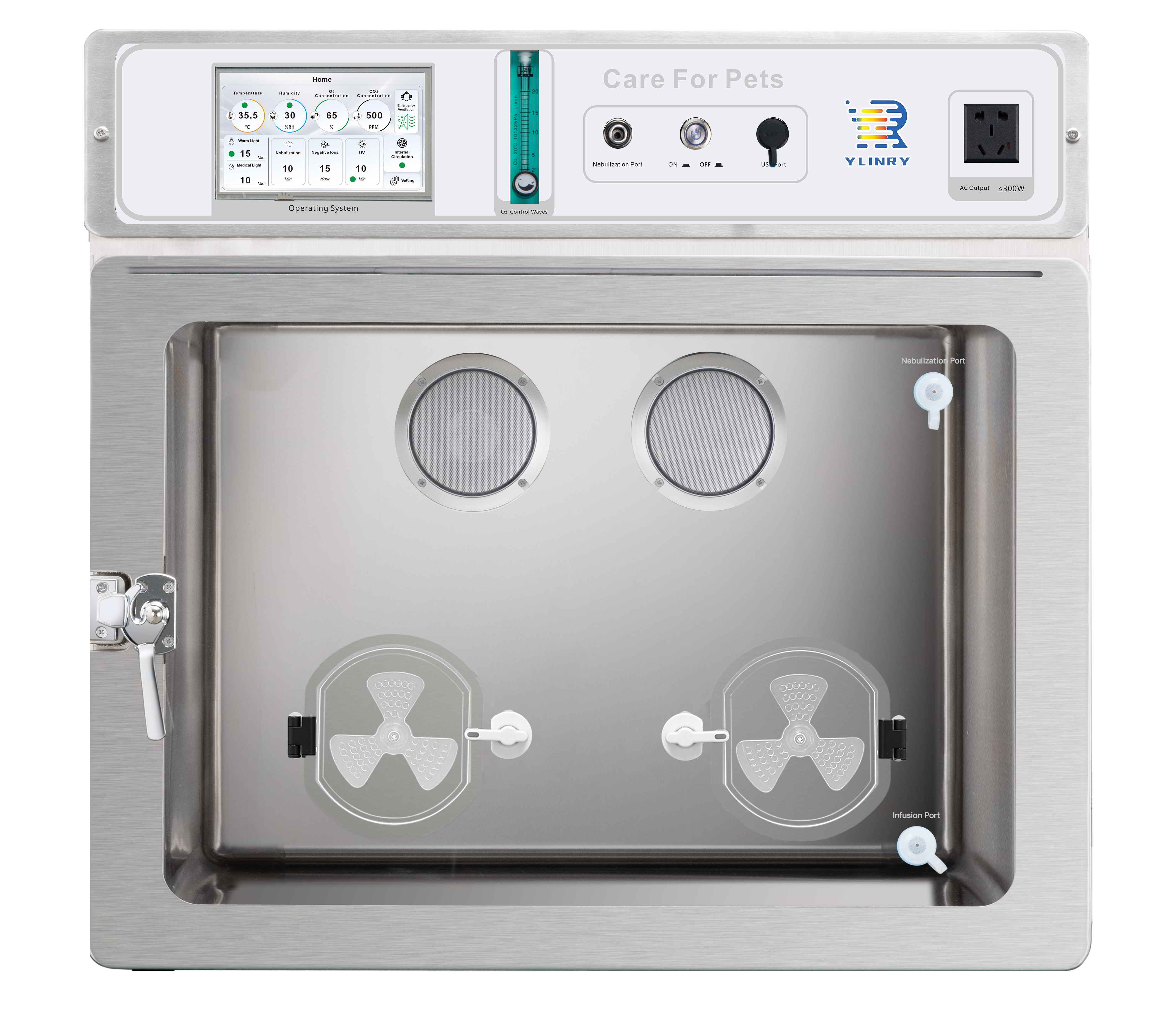 Rangos: Temp 15–45°C (refrigeración en caso de insolación, calidez para mascotas exóticas); Humedad 30–90% (ayuda a la curación); Oxígeno 21-65% (40-50% postoperatorio, moderado para pacientes cardíacos).